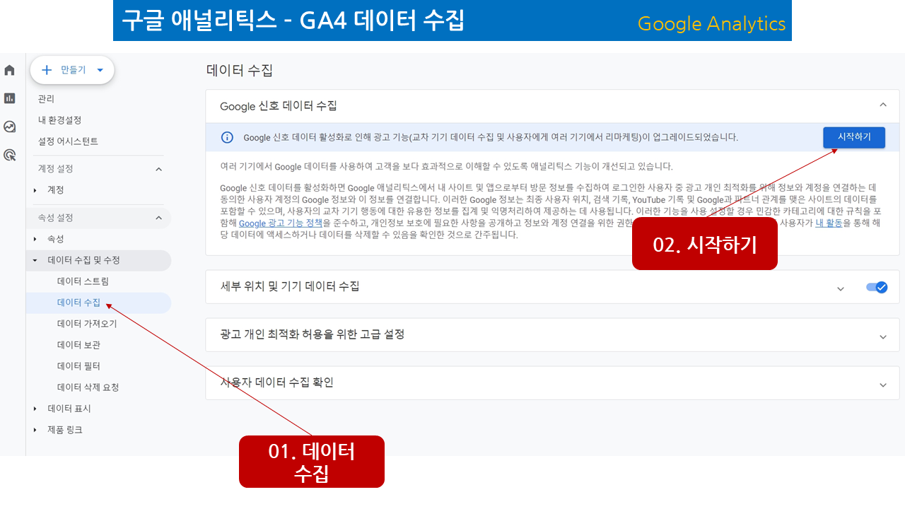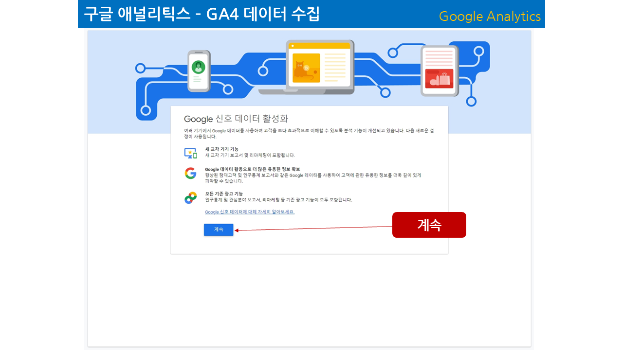 - Google 신호 데이터 활성화 화면에서 계속 클릭