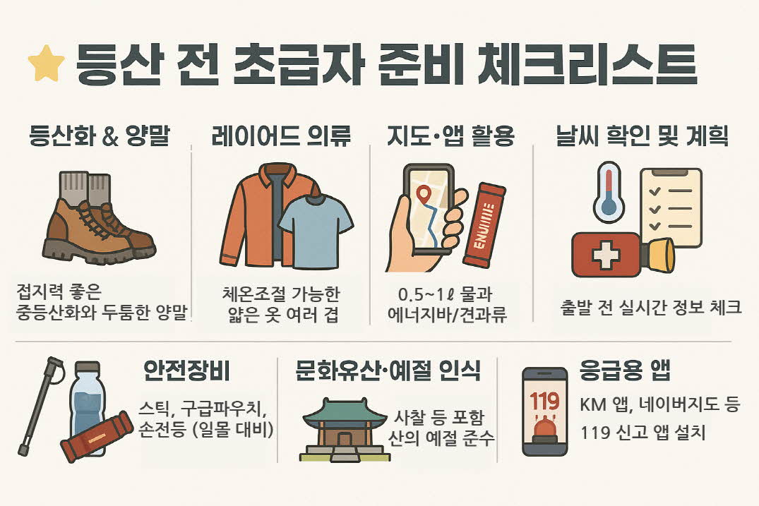 등산은 자연을 만끽하며 몸과 마음을 건강하게 하는 훌륭한 활동입니다. 하지만 초급자는 충분한 준비 없이는 안전하게 즐기기 어려울 수 있습니다. 위의 체크리스트를 참고하여 안전하고 즐거운 등산을 계획해보세요. 올바른 준비가 여러분의 등산 경험을 더욱 풍부하게 만들어 줄 것입니다!