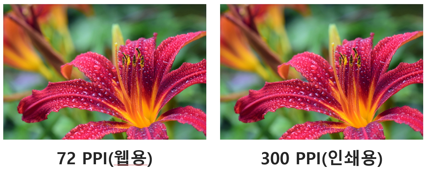 위에 이미지처럼 왼쪽은 72 PPI파일입니다. 웹에 업로드하는 용도 파일입니다. 오른쪽 300 PPI는 인쇄(출력)를 목적으로 만든 사진 파일입니다. 이미지 안에 들어가는 픽셀 수는 상당한 차이를 보입니다. 그렇지만 웹으로 보여지는 이미지는 사람의 눈으로는 분별이 어렵습니다.