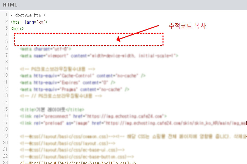 5. 디자인편집(html 편집)에서 <head>영역에 추적코드 삽입(방법 02)