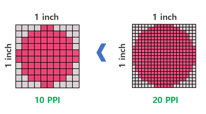 그림에서 확인가능하듯이 PPI가 높을수록 고해상도라고 부른다.